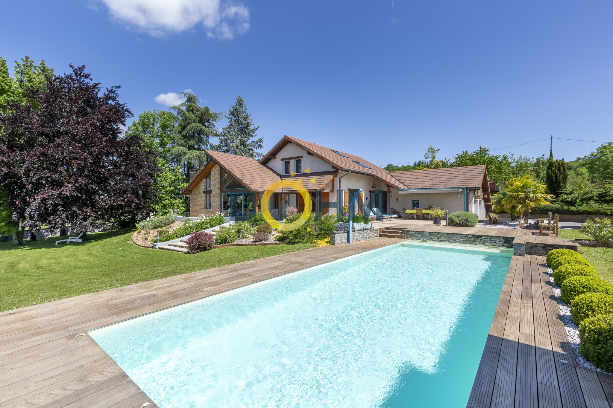 Espace piscine avec 220 m2 de terrasse : détente assurée dans un cadre verdoyant et sans vis-à-vis.