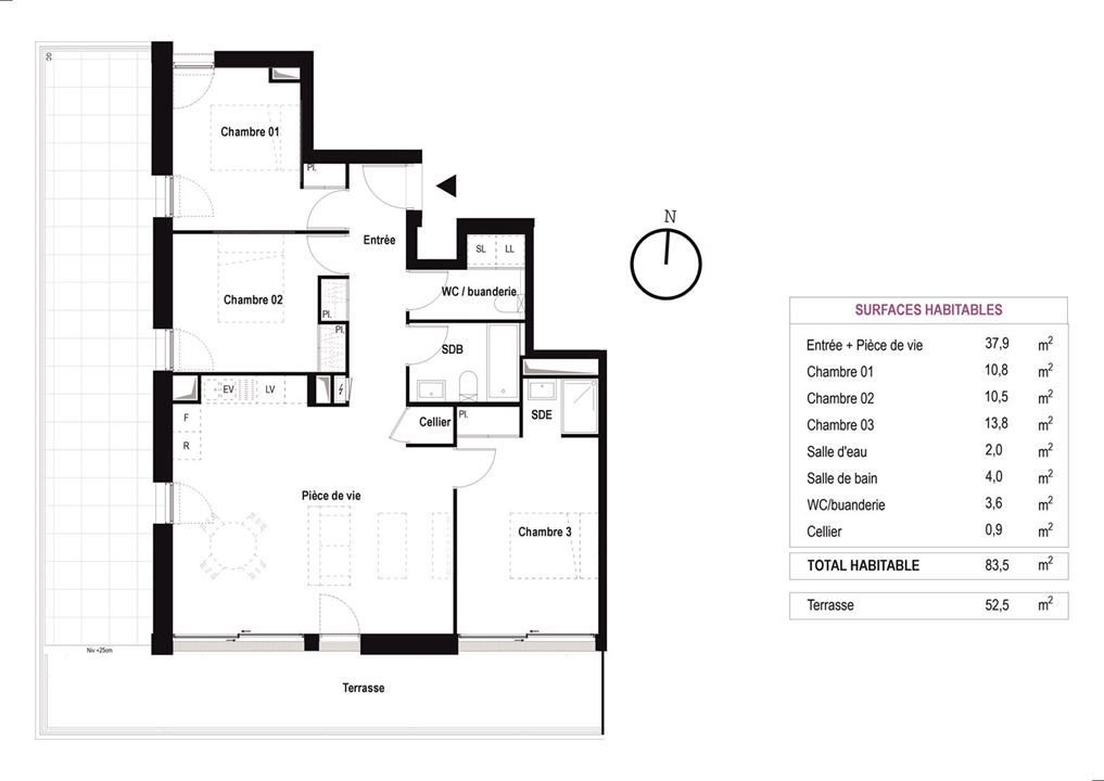 | Surface (m²) 84 m² | Année de construction 2027 | Chambres 3 chambres | Salles de bain 2 salles de bain |