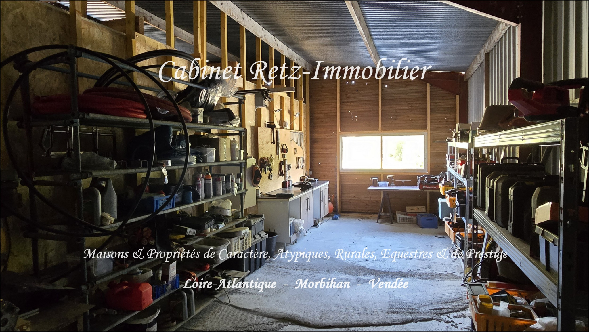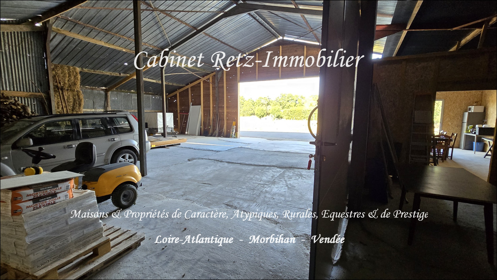 Sous promesse de vente par DEMEURES & CARACTÈRE® - À CHALLANS (85300) en Vendée, au calme, en retrait de la ville, sur 5,6 hectares, Propriété comprenant : Maison de plain-pied composée de : Entrée, séjour avec cheminée insert, salle-à-manger, cuisine labo, chaufferie/cellier/entrée de service, grande et confortable suite parentale (Chambre 1 avec rangements + pièce dressing + grande salle d'eau avec bain balnéo, douche italienne, meuble double vasque et wc suspendu séparé), chambres 2 et 3 avec rangements, bureau (ou chambre 4), salle de bain, WC indépendant. En complément : Terrasse carrelée avec store-banne électrique et paravents rétractable ; Garage fermé et réserve environ 45m2 ; Carport environ 45m2 ; Abri/bûcher ; Parking ; Joli jardin paysagé et clos (environ 2 700m2), robot de tonte récent ; Potager ; Hangar d'env. 270m2 comprenant grand espace de stockage (idéal aménagement de boxes pour propriétaire de chevaux), atelier et salle de détente ; 5,5 hectares de prairie de belle qualité (3 grandes prairies avec haie bocagère) en partie drainés. Tout cela au calme et en parfait état d'entretien, en campagne, à proximité de toutes les commodités, à 20mn des plages, 25mn de LA ROCHE SUR YON et 40mn de NANTES. Complément d'informations et rendez-vous de visite sur demande. Ce bien vous est présenté par le Cabinet Retz-Immobilier, spécialiste de l'immobilier de Caractère, Atypique, Rural, Équestre, d'Exception & de Prestige en Loire-Atlantique, Morbihan et Vendée. - @MNNRICD - Contact : Chris DUBOIS. Mandat exclusif de vente no110915-219130.