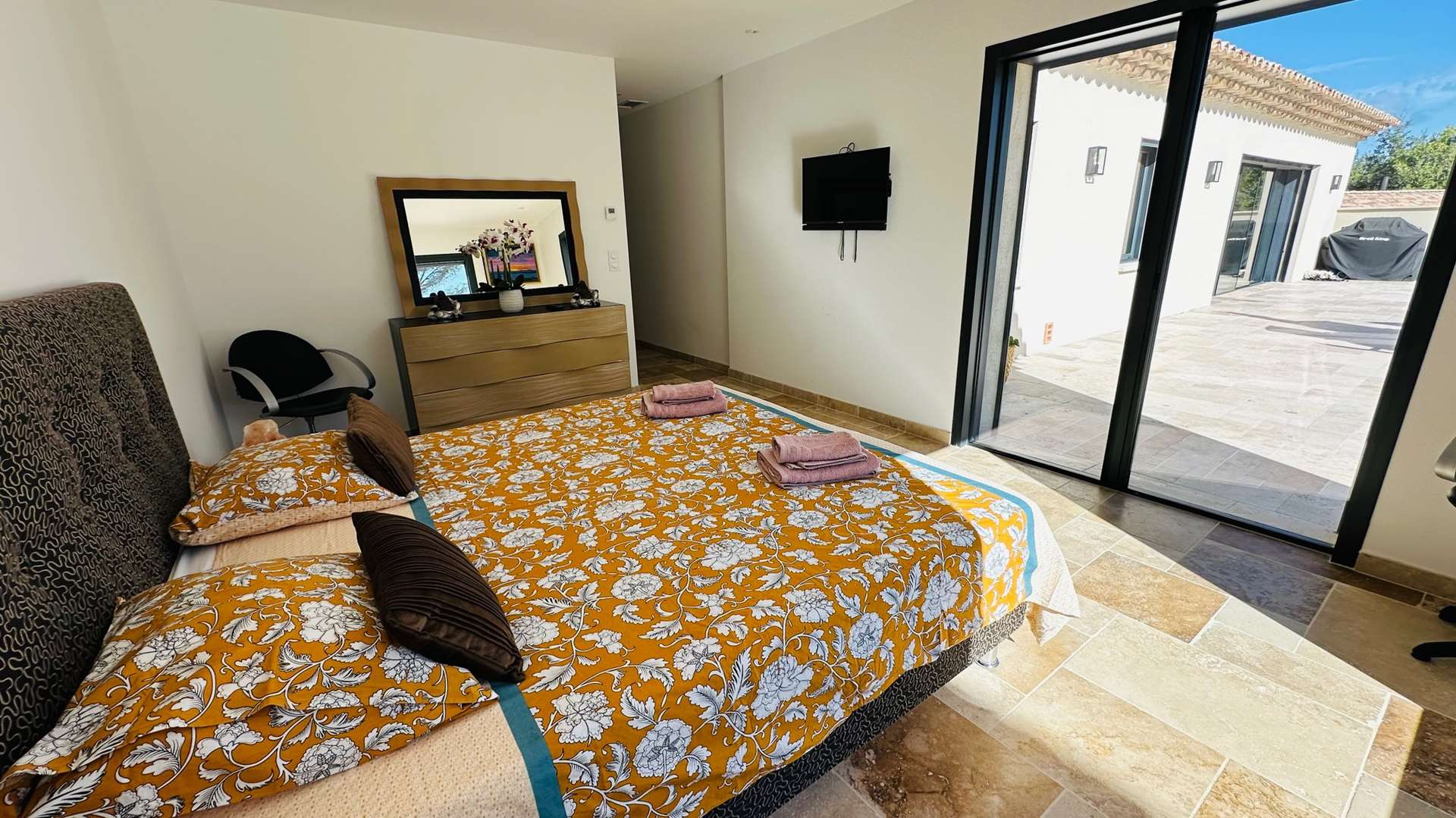 - Une vaste Chambre en Suite parentale ouvrant par une baie vitrée sur la terrasse, comprenant une salle d'eau douche italienne et bain -WC- 1 pièce aménagée en dressing -