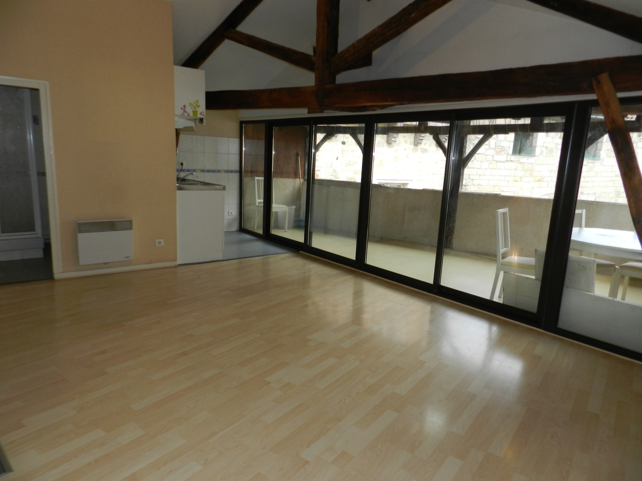 Au troisième et dernier étage d'un immeuble au coeur du centre ville de Figeac, appartement T2 avec coin cuisine aménagé, grand séjour, mezzanine, chambre, salle d'eau, wc indépendant et terrasse.
