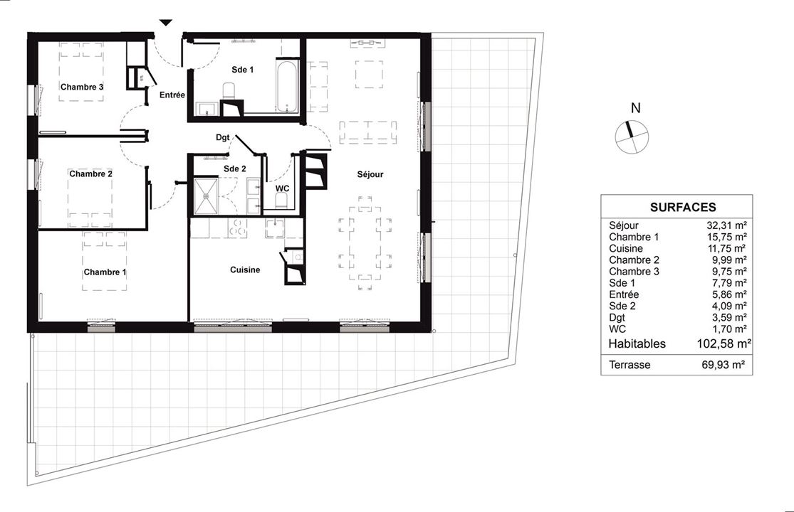 | Surface (m²) 102 m² | Année de construction 2024 | Chambres 3 chambres | Salles de bain 2 salles de bain |