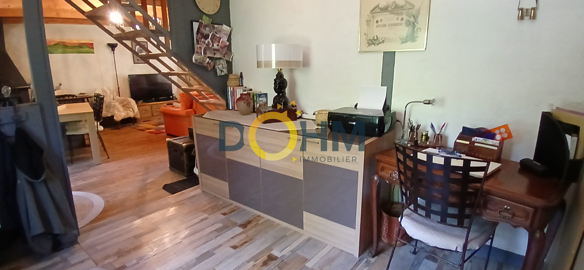 Au dessus en rez-de-jardin pièce de vie avec poêle à bois pour le chauffage, cuisine, bureau, salle d'eau, toilettes
