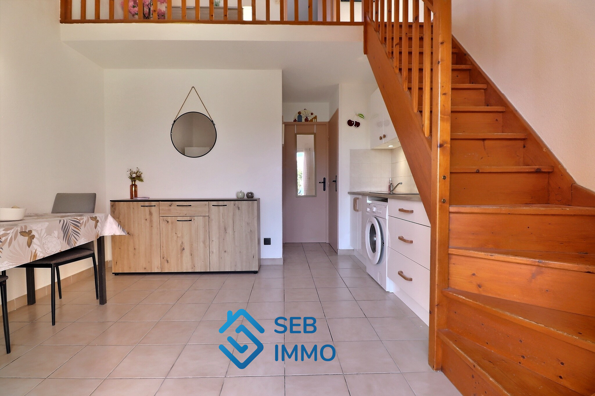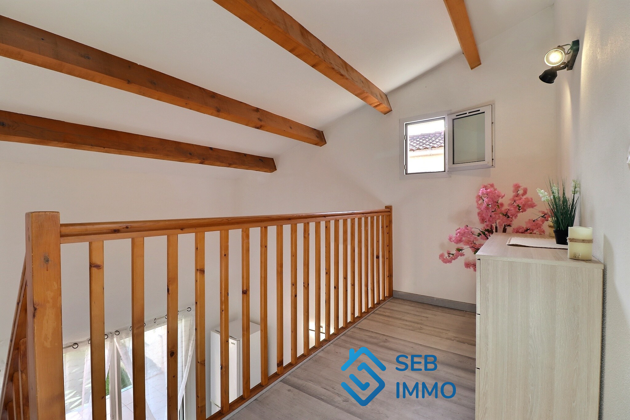 À l'étage, vous trouverez une mezzanine lumineuse (possibilité d'agrandissement avec un gain potentiel de 9 m2 supplémentaires) ainsi qu'une chambre avec placard intégré.