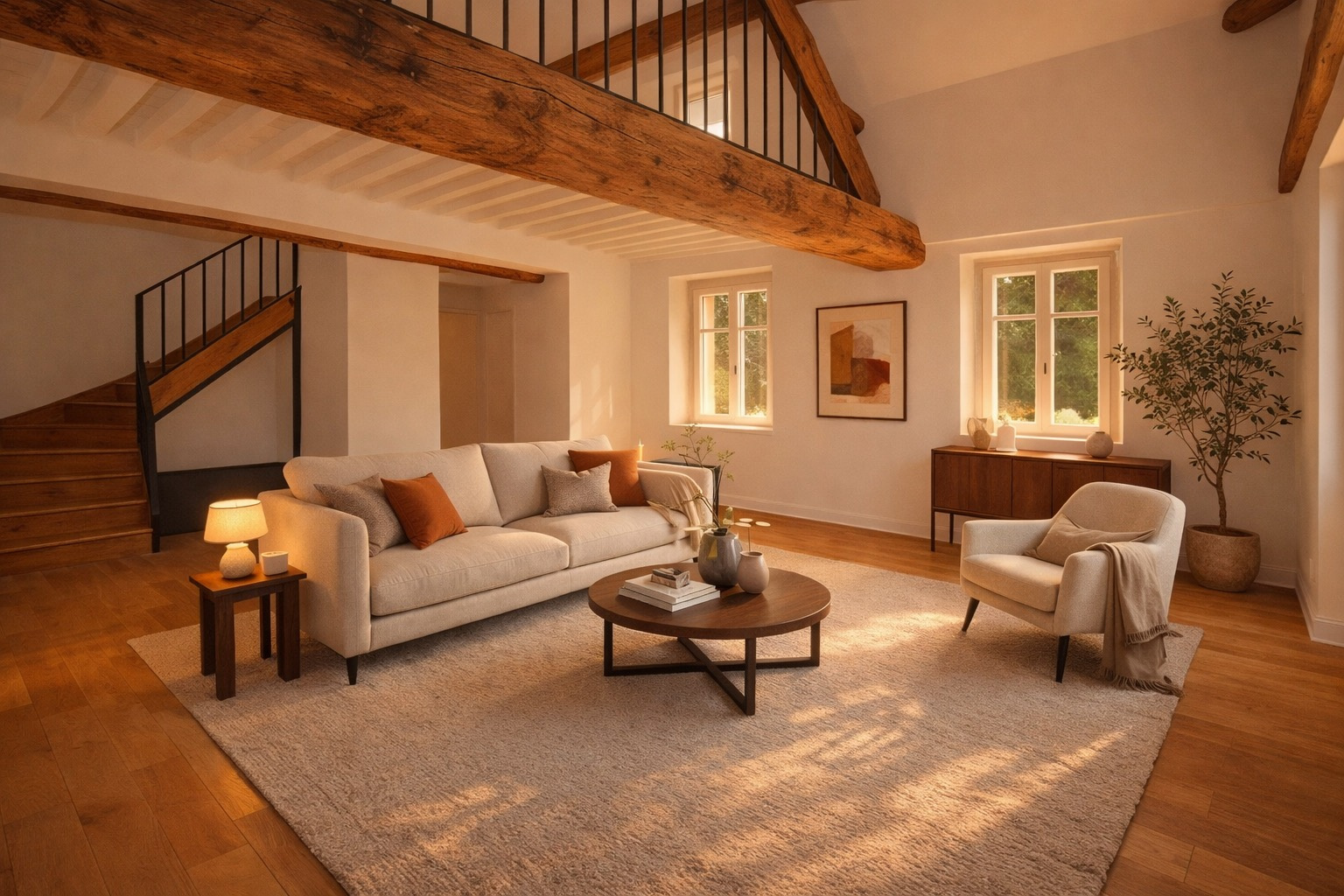 Il conserve les éléments d'époque : parquet ancien, poutres apparentes, cheminée. La distribution est fluide et les volumes sont généreux. Il comprend trois grandes chambres, avec la possibilité d'aménager une quatrième selon les besoins.