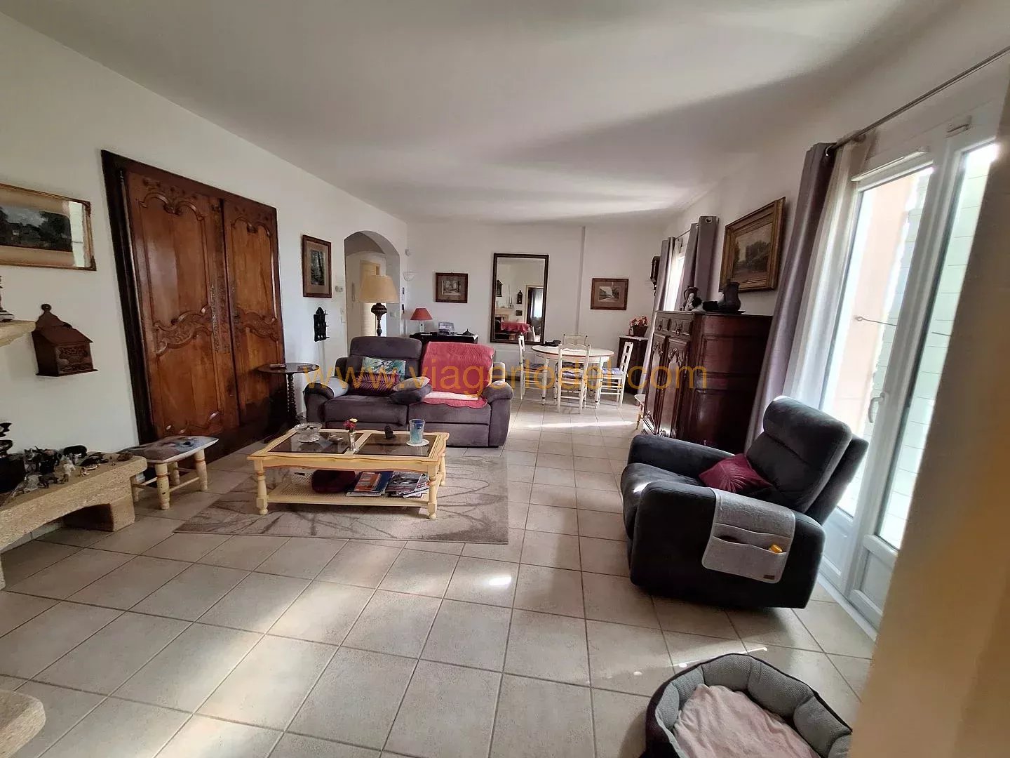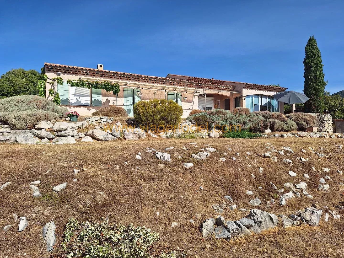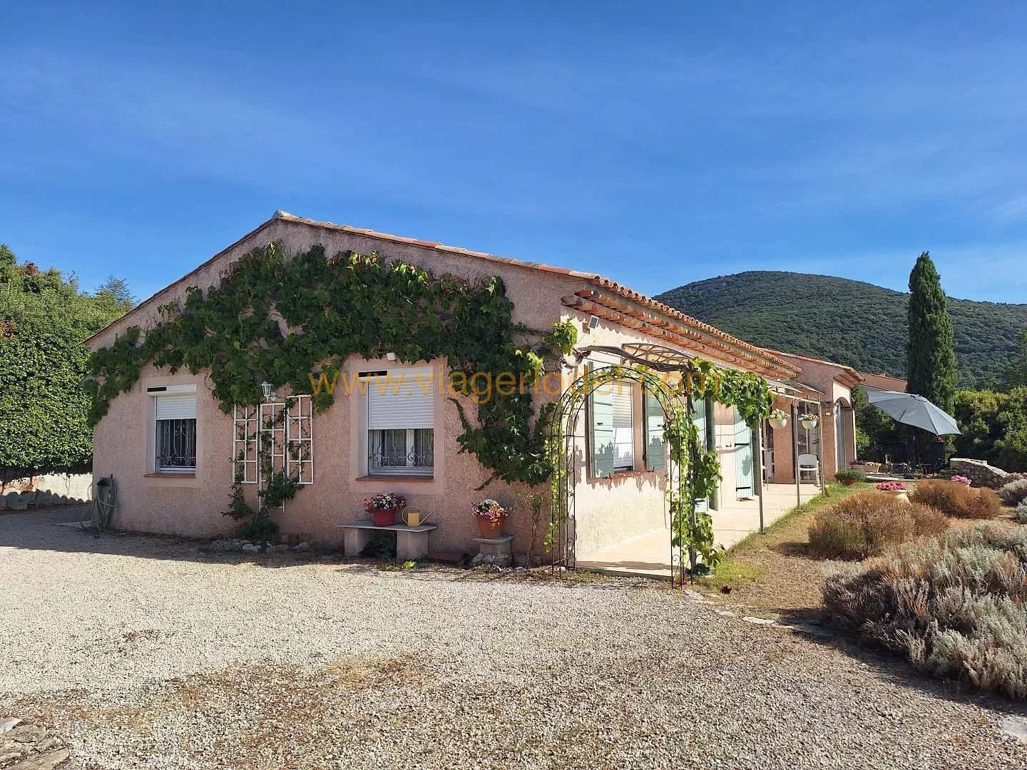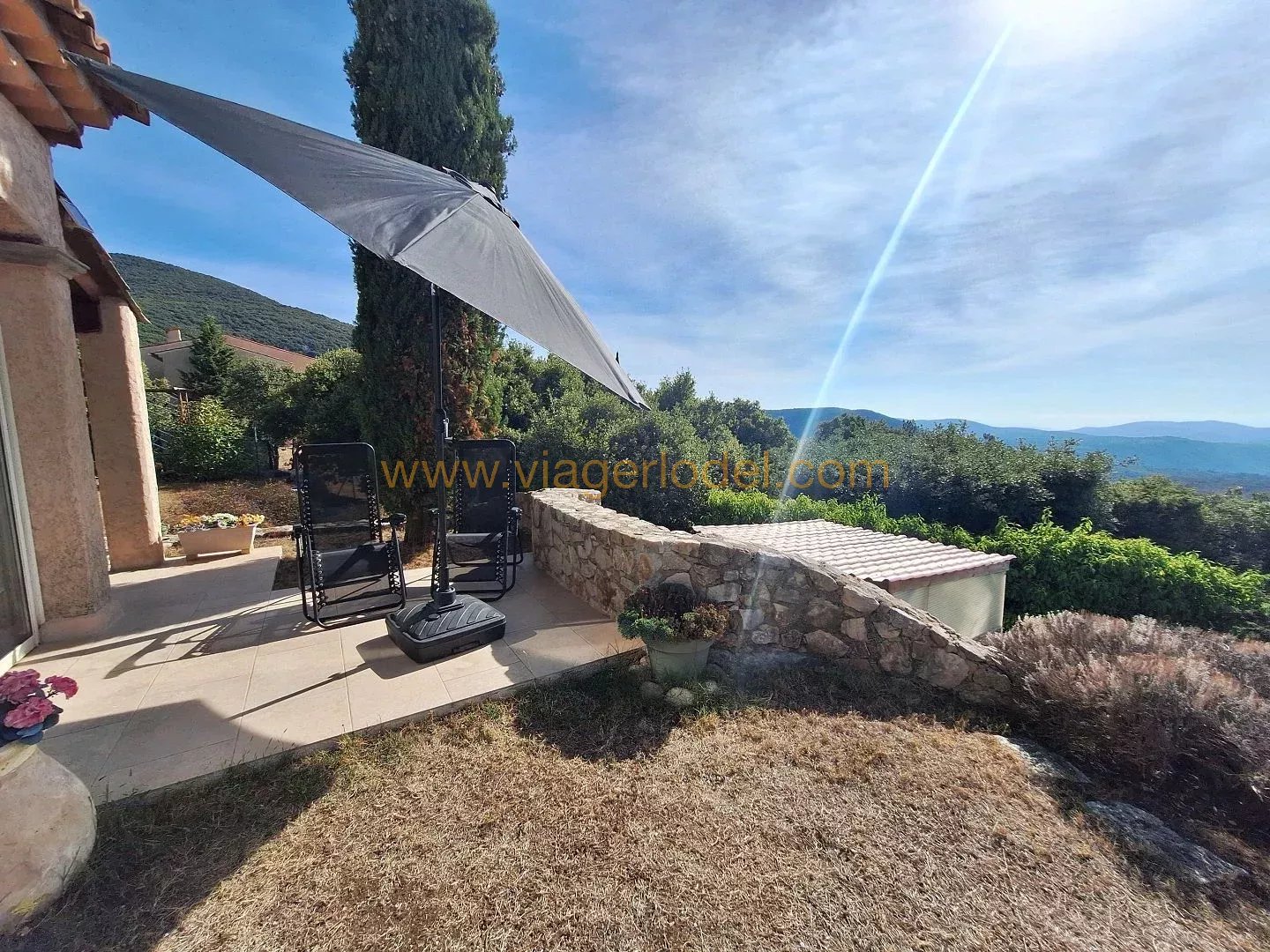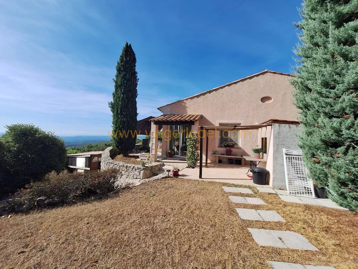 Réf. 9883 VIAGER OCCUPE, MONS (83) Réf. 9883 VIAGER OCCUPE, MONS (83): Domaine résidentiel à 2,7kms du centre village Villa 4P 120,03m² de plain pieds sur 2 335m² clos, piscinables, joliment arborés et aménagés. VERANDA, TERRASSES, CHALET, CAVE, ABRIS BOIS et AUTO, PARKING. Superbe vue Sud lointaine (Esterel, îles de Lérins, aperçu mer). Prestations de qualité : volets solaires, portail automatisé, alarme, portes intérieures à galandage, combles isolés, climatisation). Villa en parfait état d’entretien, spacieuse, ensoleillée, fonctionnelle dans un environnement paisible à 800m d’altitude, sans vis-à-vis ni nuisances, et à une heure du bord de mer (Fréjus, Mandelieu). Superficie habitable: 120,03m² + VERANDA 21,21m² + CAVE 23,12m² + CHALET 16,17m² + TERRASSES + ABRIS BOIS et CABANON + ABRIS AUTO + PARKING Chauffage par climatisation réversible + insert. Eau chaude/cumulus. Sols : Carrelages. Construction 2000 sur 1 335 m² sur vide sanitaire. Assainissement : fosse septique. BOUQUET 90 000 euros HAI + rente de 1 335 euros indexée. OCCUPE 2 têtes 79 ans (D) & 79 ans (D). Valeur vénale : 425 000 euros. Taxe foncière : 403 euros/an dont TEOM 358 euros. Les informations sur les risques auxquels ce bien est exposé sont disponibles sur le site Géorisques : www.georisques.gouv.fr.