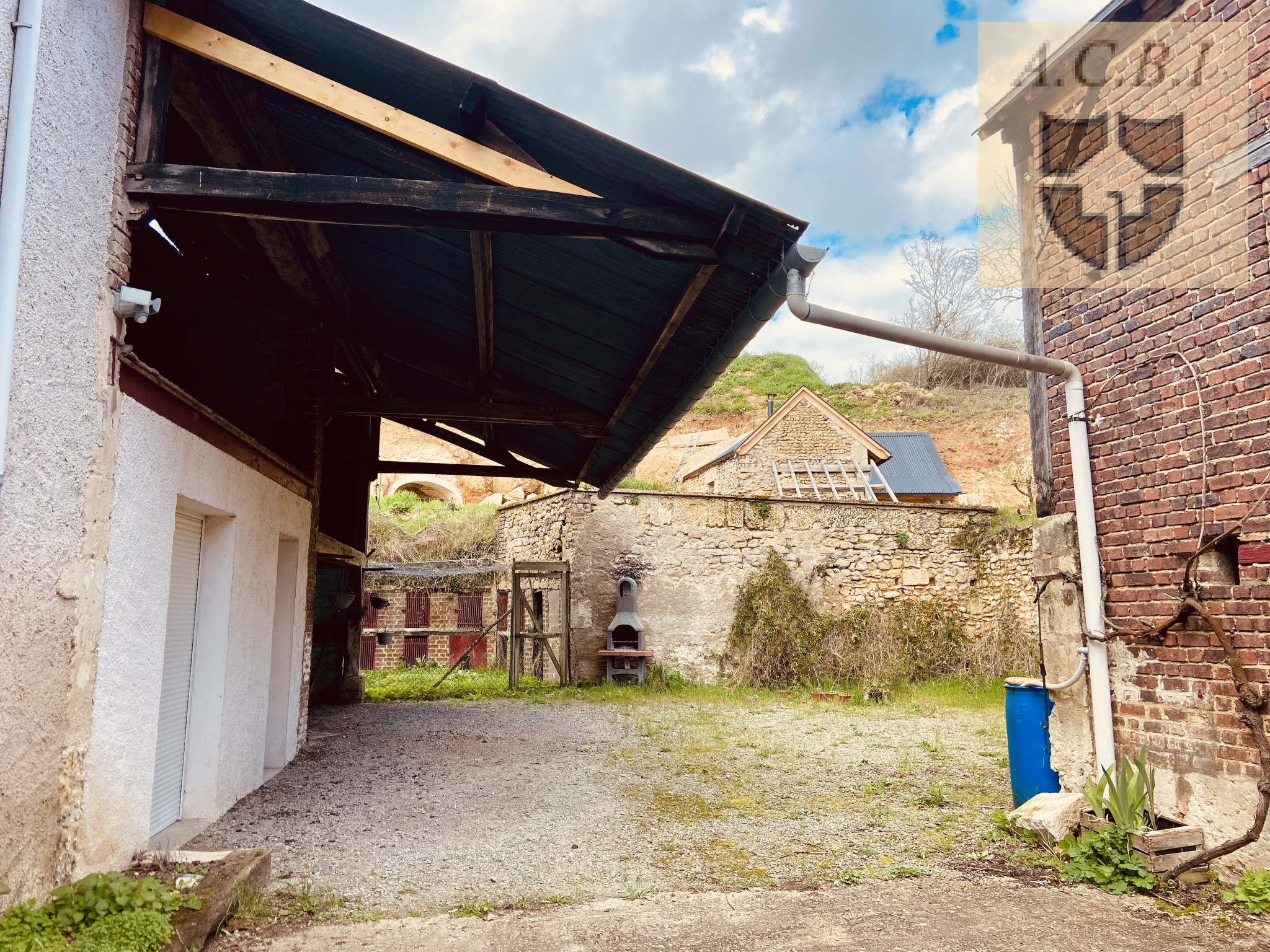 La cour centrale offre du volume, et se prolonge d'un joli espace protégé (avec accès à 2 petites caves troglodytes), actuellement utilisé en clapier / poulailler, mais qui pourrait devenir un bel espace d'agrément, permettant également de rejoindre une petite parcelle de terrain en terrasse.