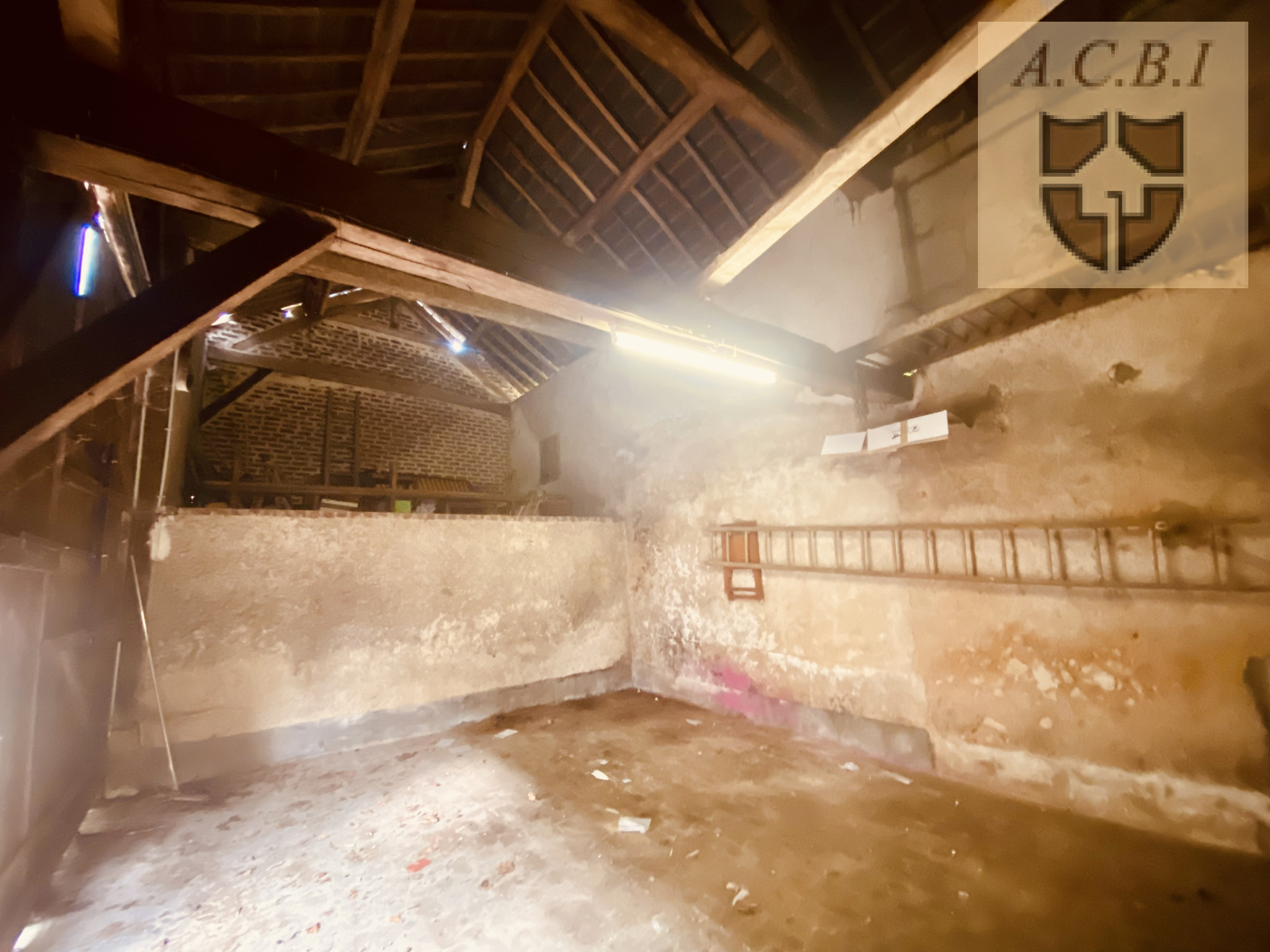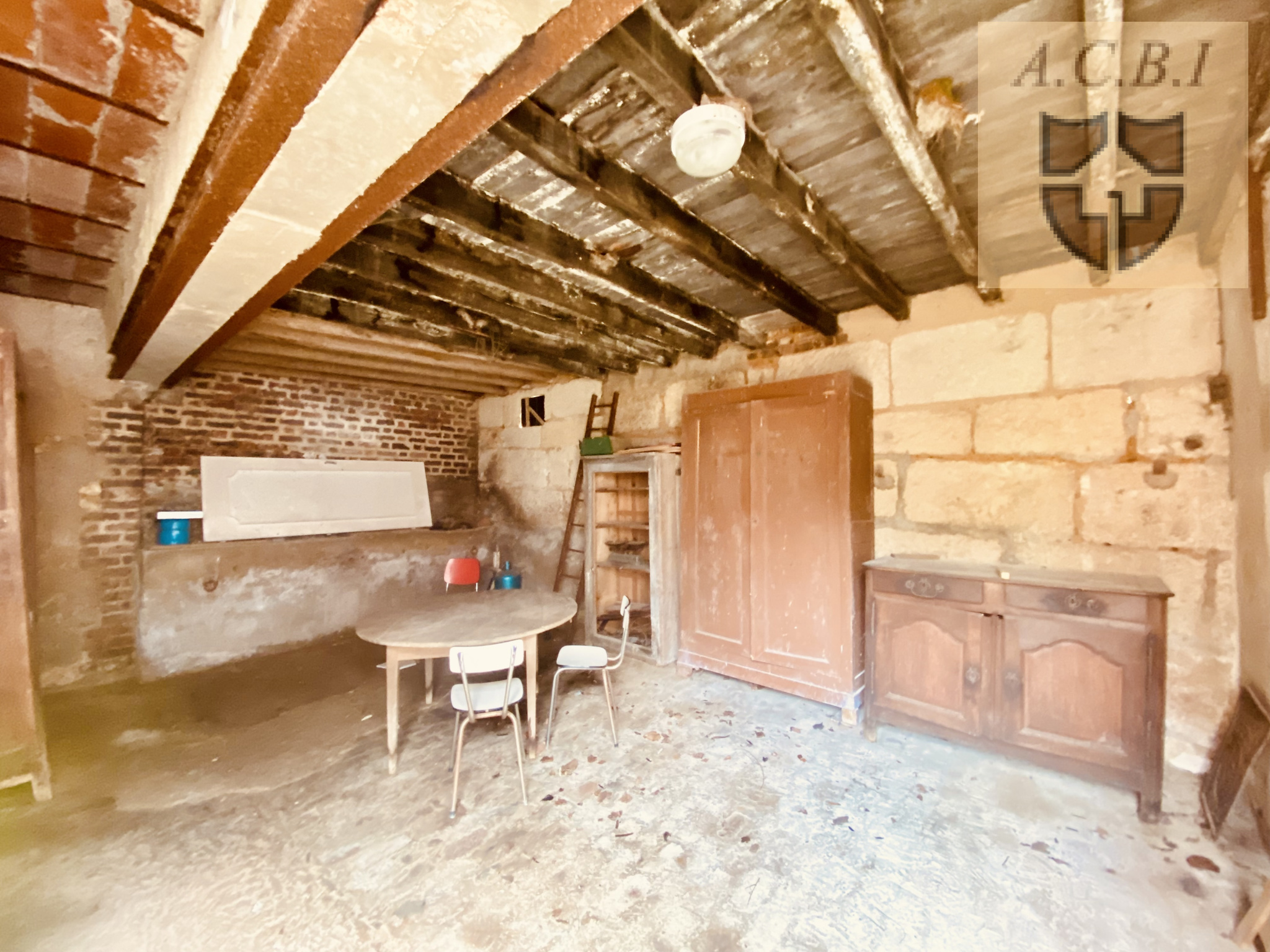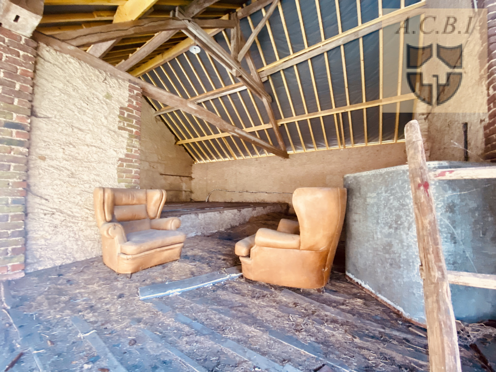 En face, vous profitez d'une belle grange en brique, un grande pièce à usage possible d'atelier, et un cellier sur sol terre (la totalité pour environ 80m2 au sol, avec greniers complémentaires).