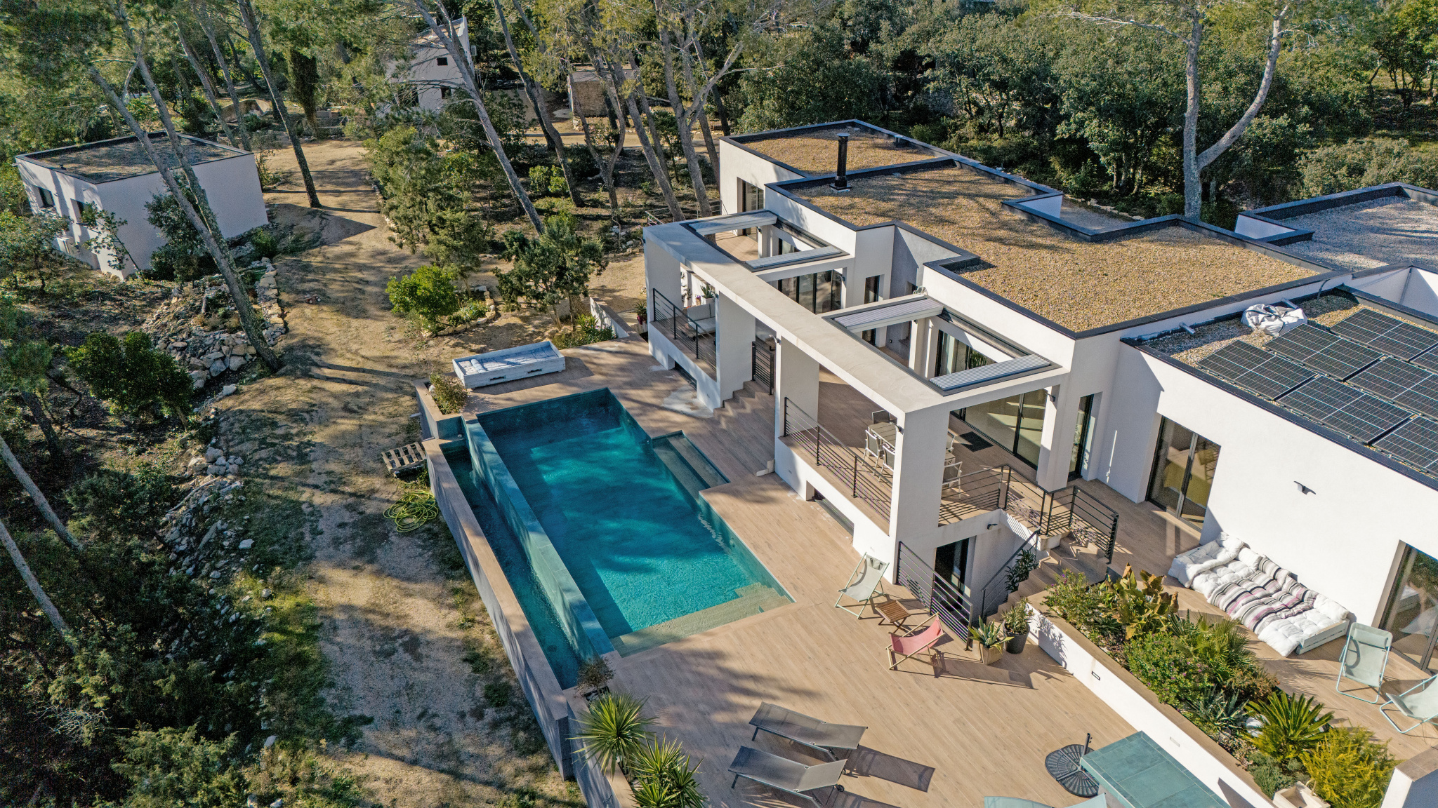 *30 Gard, Nimes, *PROPRIETE D'EXCEPTION, sur les Hauteurs avec VUE MAGNIFIQUE DEGAGEE, IMPRENABLE, se perdant sur la Mer et le Ventoux, quartier de PRESTIGE des Huppes, sur un vaste Terrain de 10.000m2 (divisible en 2) de garrigues, pins, chênes, thym, aux fragrances méditerranéennes, sans oublier les écureuils du matin. Grande, vaste et sublime maison d'architecte, construite en 2020, contemporaine, aux lignes épurées, moderne, parfaitement pensée et réalisée, facile à vivre, de 190m2 comprenant 1 Séjour/Cuisine, 1 salon avec cheminée, 1 suite parentale, 3 chambres, 1 piscine avec grande terrasse DOMINANTE, 1 double garage, 1 espace bien être (salle de musculation, salle de musique...); Un MAZET indépendant, remis au gout du jour, Un T2 Indépendant réalisé avec la même quête de perfection pour recevoir les amis, ou les enfants, un bureau pour profession libérale, ou salle de danse, de soin, de musique, de méditation.... . Un Mobil home indépendant. Un Havre de paix, de Charme, d'élégance et de subtilité, un Eden à 2 pas du centre ville et de toutes les commodités. Laissez vous envouter par le charme de ce lieu enchanteur. Des panneaux solaires permettent des économies substantielles d'énergie. Sur les hauteurs de Nimes, ville située entre Marseille et Montpellier, à Proximité d'Avignon et Uzès, des lieux chargés d'histoire et de tradition. Située à 3/4h de la mer et 3/4h de la montagne. A proximité de l'autoroute, à proximité des Gares TGV. Pour tout renseignement: Jean-Christian, Votre Accompagnateur, 06.12.61.71.37