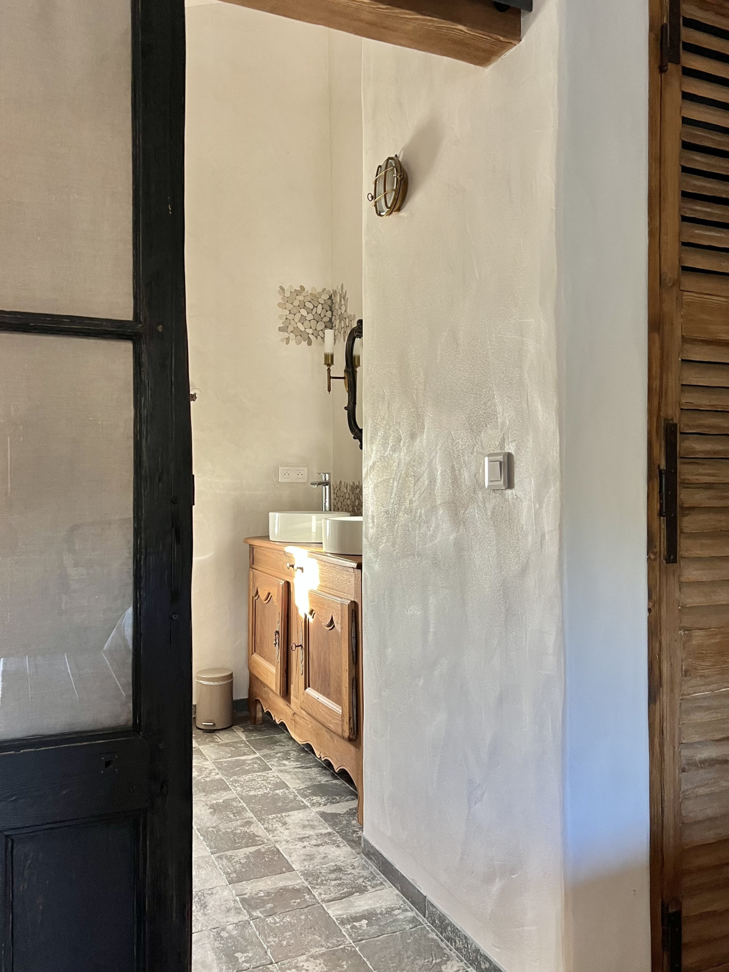L'entrée donne le ton des matériaux nobles et d'un esthétique sûr. Nous retrouverons la pierre, le bois, le fer forgé, les enduits à la chaux mariés aux pierres bruts, sur toute la surface habitable.