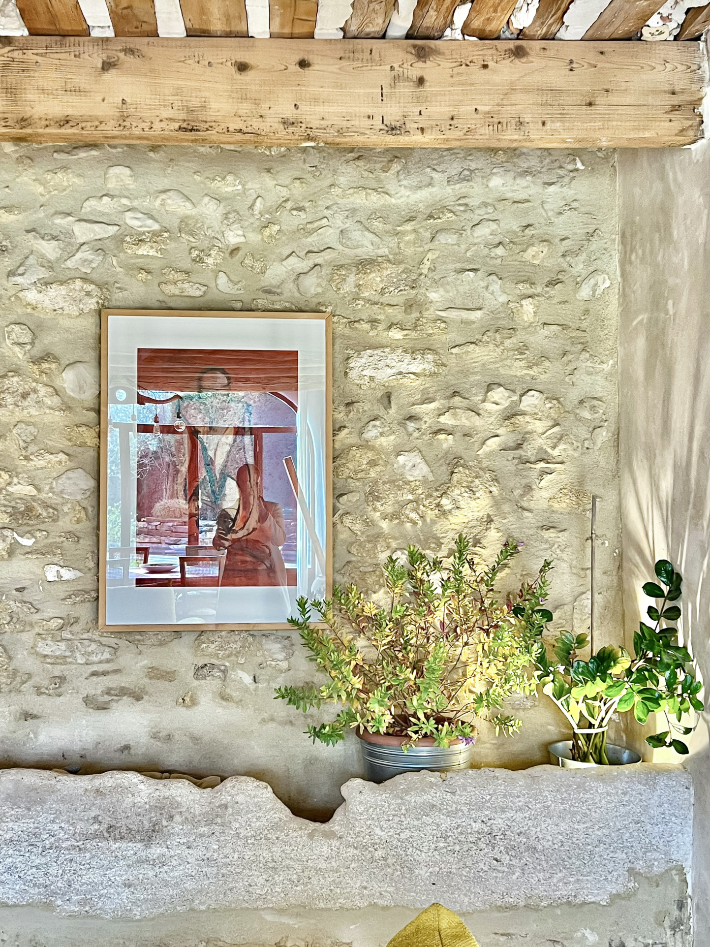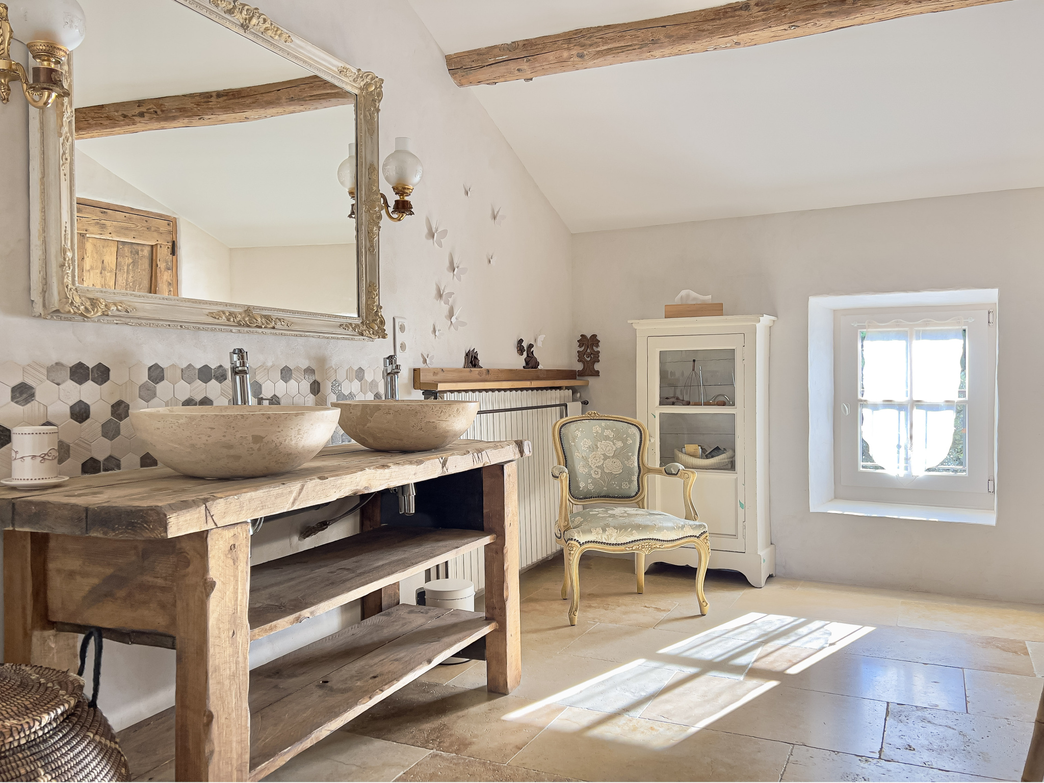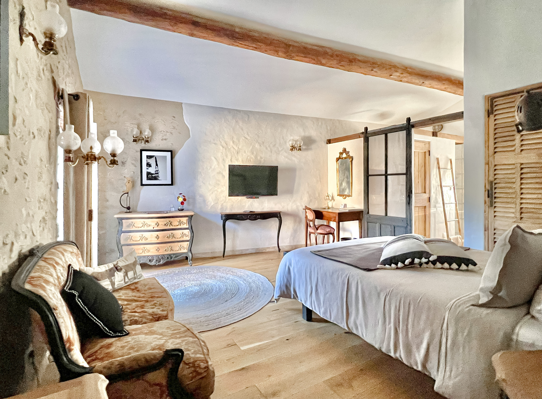 La porte cochère au sein de la pièce de vie, lui confère un bel éclairage naturel ainsi qu'une jolie perspective sur la terrasse et la piscine. L'abreuvoir en pierre au fond du salon apporte une touche indéniablement authentique.