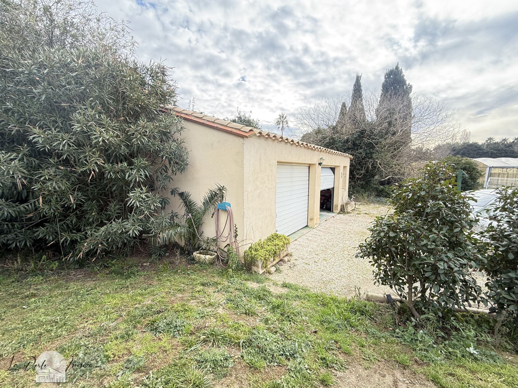Un double garage de 50 m2 avec portes électriques sectionnelles vous garantit un stationnement sécurisé, tandis qu'un portail électrique assure l'accès à la propriété.