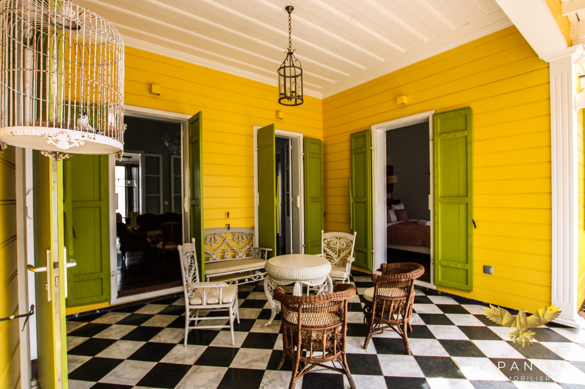 À gauche de la villa, le pavillon d'amis évoque une époque où l'hospitalité était un art. Ses chambres à l'étage, conçues comme des cages à oiseaux suspendues dans les arbres, transportent l'occupant dans un univers aérien. Perchées parmi les branches, ces suites offrent une vue imprenable sur le jardin, créant un lien intime avec la nature environnante. Le pavillon, tout comme la villa principale, incarne l'accueil généreux et le raffinement créole. Il est un lieu où l'on se sent à la fois chez soi et en voyage, un endroit parfait pour recevoir famille et amis dans un confort absolu.