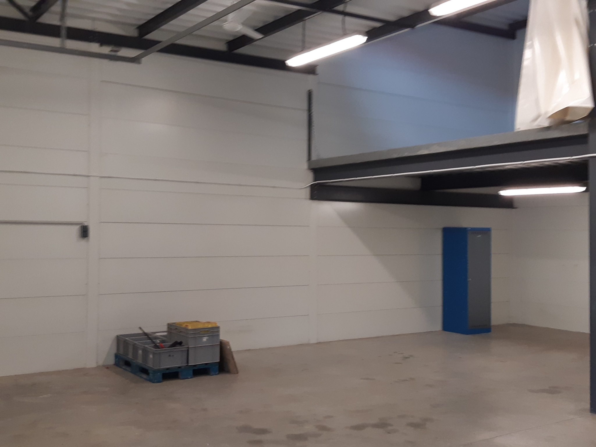 Au 1er étage bureaux de 21m2 et espace de stockage de 77m2 en mezzanine accessible par l'atelier.