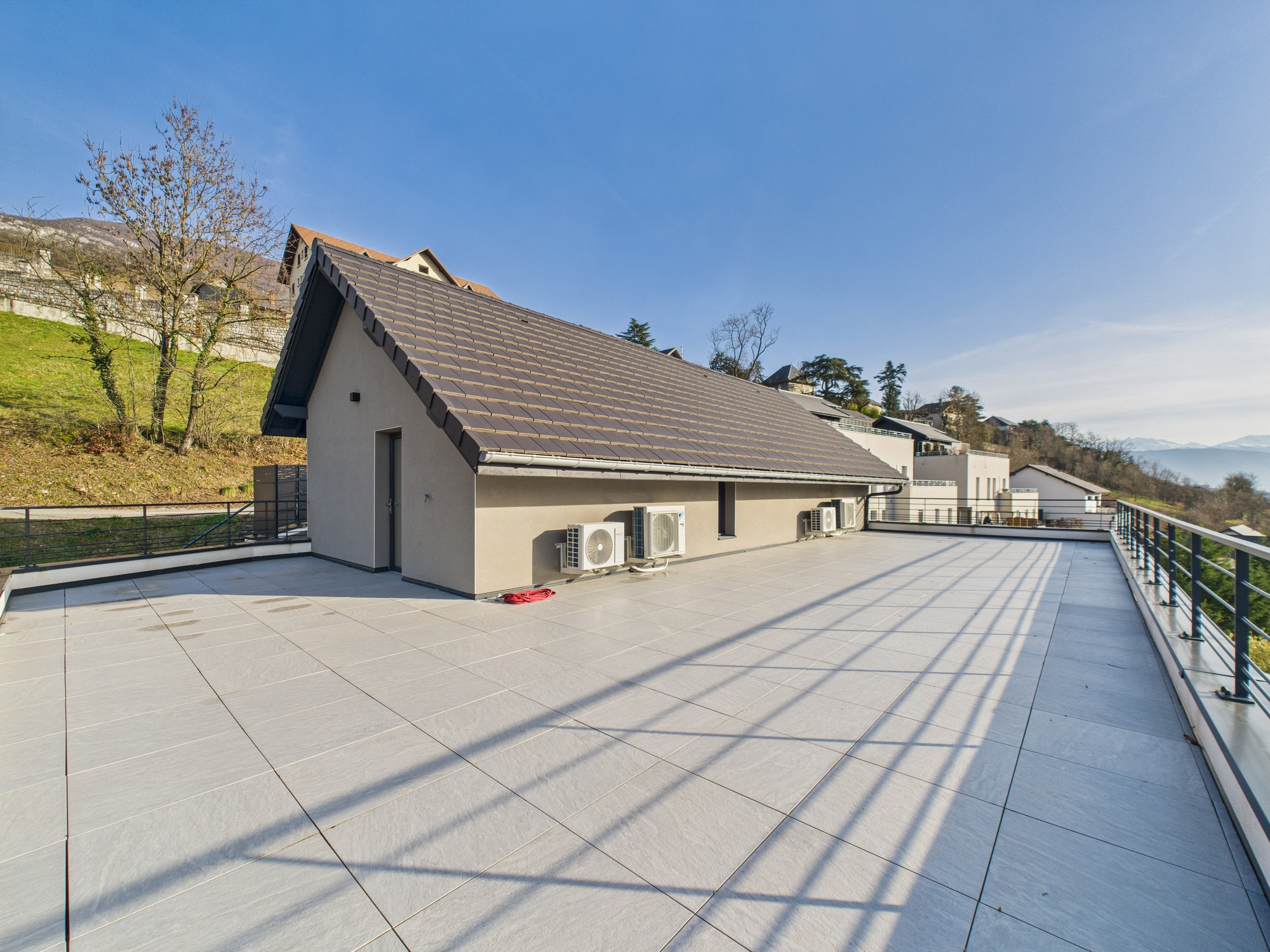- surface habitable : 115m2 - Garage fermé de 22m2 avec porte motorisé - Deux terrasses dont une exceptionnelle terrasse rooftop de 170m2 au dernier étage offrant une vue imprenable sur les montagnes - jardin privatif sur terrain de 350m2, idéal pour un potager ou espace détente - Place de parking privative et local à vélos