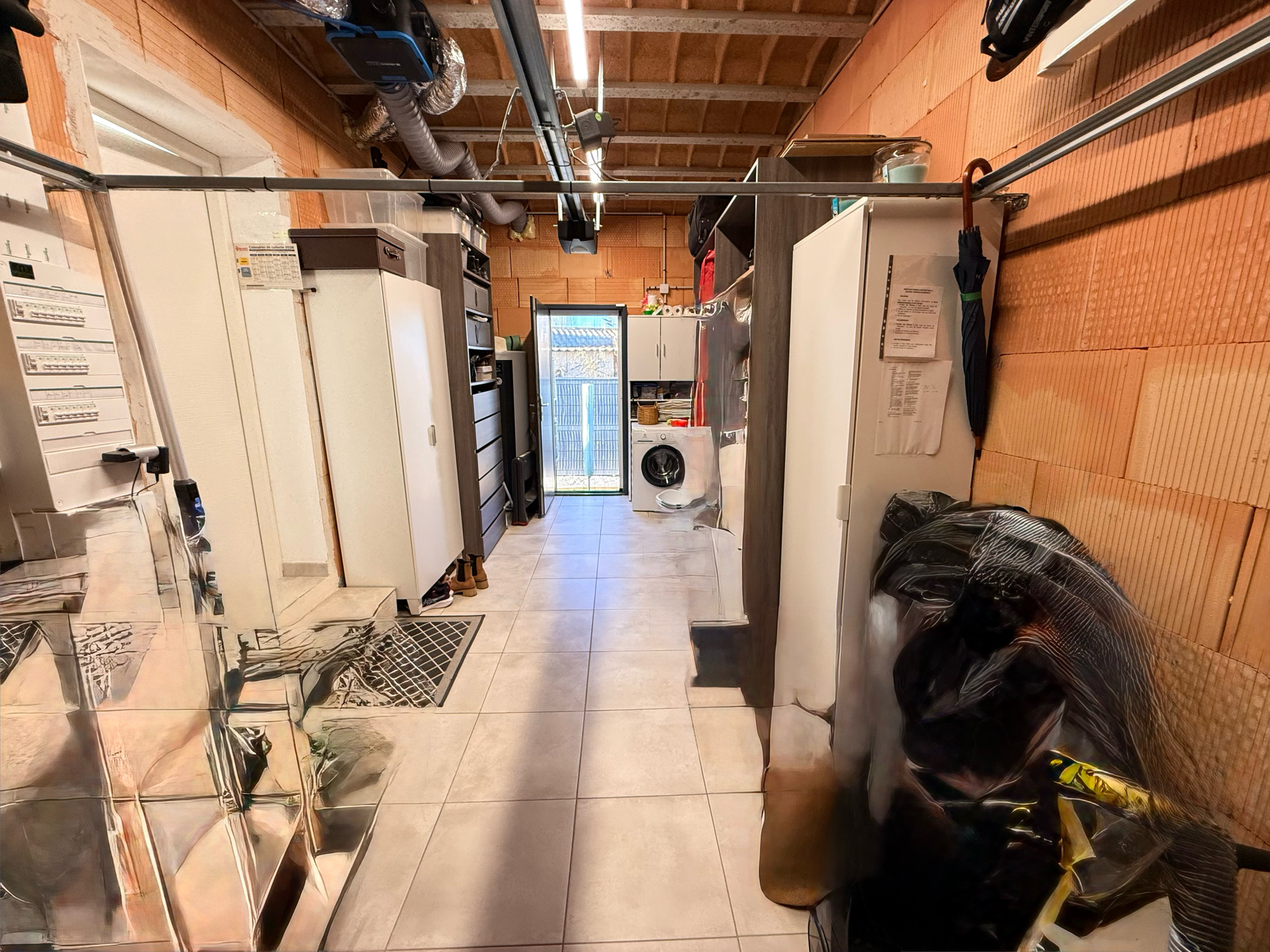 Garage carrelé avec accès au jardin.