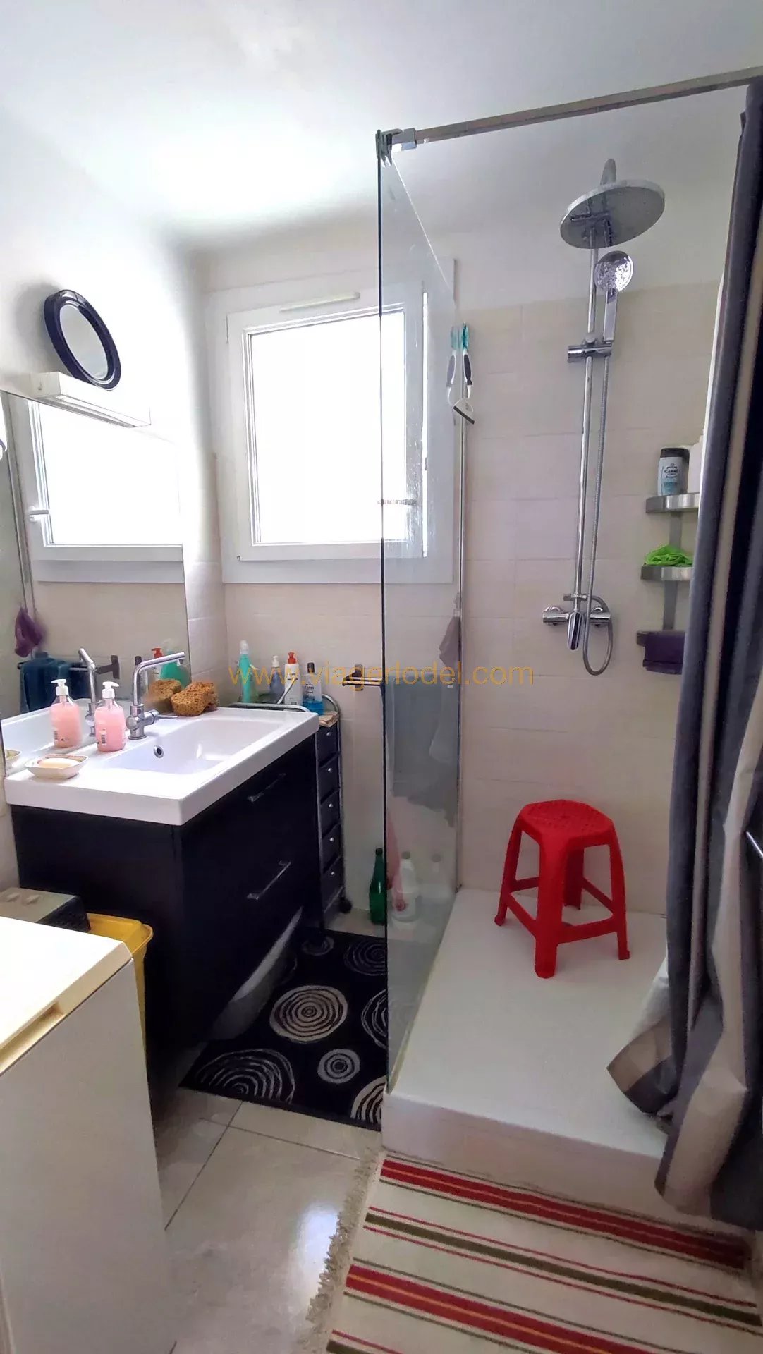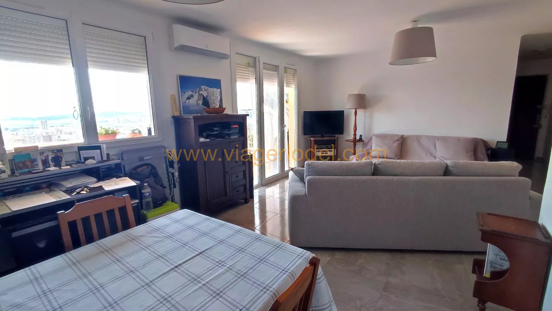 Réf. : 9847 - VENTE AVEC RESERVE DU DROIT D'USAGE ET D'HABITATION - TOULON (83) Réf. : 9847 - VIAGER OCCUPE SANS RENTE LE BAS FARON – LE HAUT DE CLARET Un Bel et lumineux APPARTEMENT traversant de 4 PIECES bénéficiant d’une belle vue mer panoramique à 180°, au sein d’un quartier résidentiel sur les hauteurs, dans une résidence au calme d'une impasse à 300 m. du Bus desservant le centre-ville, il est situé au 2ème étage (sur 3), la vue étant également sur le Cap Sicié, la presqu’île de Saint Mandrier, les Sablettes et la Seine sur Mer. Il se compose : • Un hall d’entrée, • Une cuisine aménagée, • Un séjour double (possibilité 3ème chambre) sur BALCON Sud, • Deux chambres, • Une salle d’eau avec fenêtre, • Un w.c. indépendant. Sols : Carrelages Superficies : 62.55 m² + BALCON 8.85 m². Chauffage par convecteurs électriques (climatisation réversible dans le séjour), eau chaude par cumulus • Un CELLIER au rez-de-chaussée. • Un GARAGE 16.70 m² en rez-de-chaussée. N.B. : Appartement avec double vitrage, bien entretenu, dans une résidence avec parking collectif. Faibles charges. BOUQUET : 201 500 euros HAI - SANS RENTE OCCUPE 1 TETE : 79 ans (M) Valeur Vénale : 300 000 euros Les informations sur les risques auxquels ce bien est exposé sont disponibles sur le site Géorisques : www.georisques.gouv.fr T.F. : 419 euros (OM) Charges : 68 euros / mois RCP du 24/11/1960 - Nombre total de lots : 152 dont 62 principaux