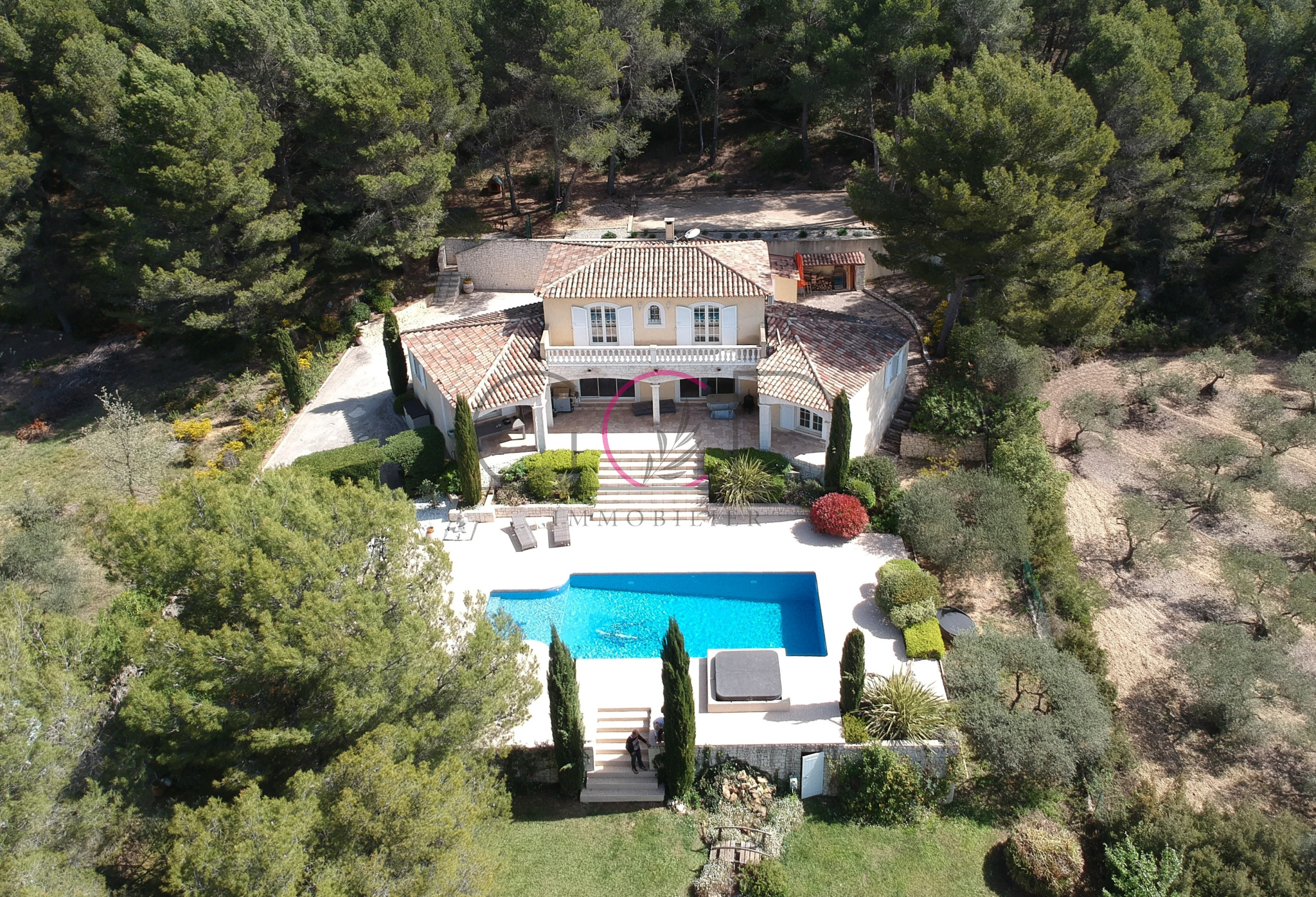 Prestations de qualité : chauffage au sol par pompe à chaleur, climatisation, cheminée en pierres de Rognes, grandes baies vitrées, sols en pierre et menuiseries bois. La villa est classée DPE C et se trouve dans un cadre calme et verdoyant, à seulement 500 m des transports.