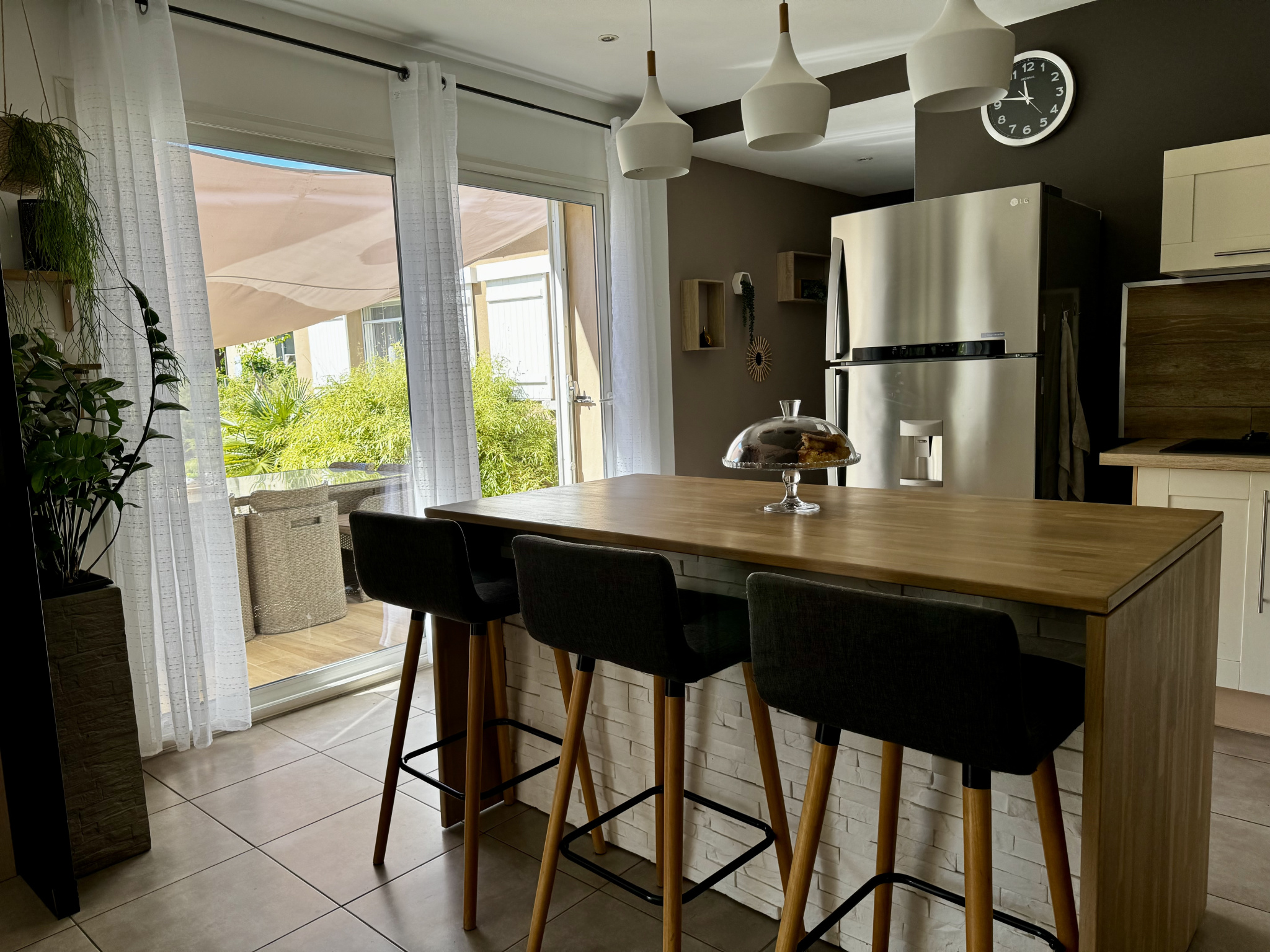 La partie Jour est composée d'une Splendide Pièce de Vie de presque 60 m2 avec Cuisine entièrement équipée Ouverte sur l'espace Salle à Manger / Salon Cosy et Chaleureux avec son Poêle à bois, le tout baigné de lumière avec ses grandes Baies vitrées donnant coté EST sur une Terrasse Couverte et côté Sud directement sur une Terrasse carrelée, le Jardin et la Piscine avec une superbe Vue panoramique sur les montagnes environnantes... On trouve également un Bureau, et un Cellier/Buanderie.