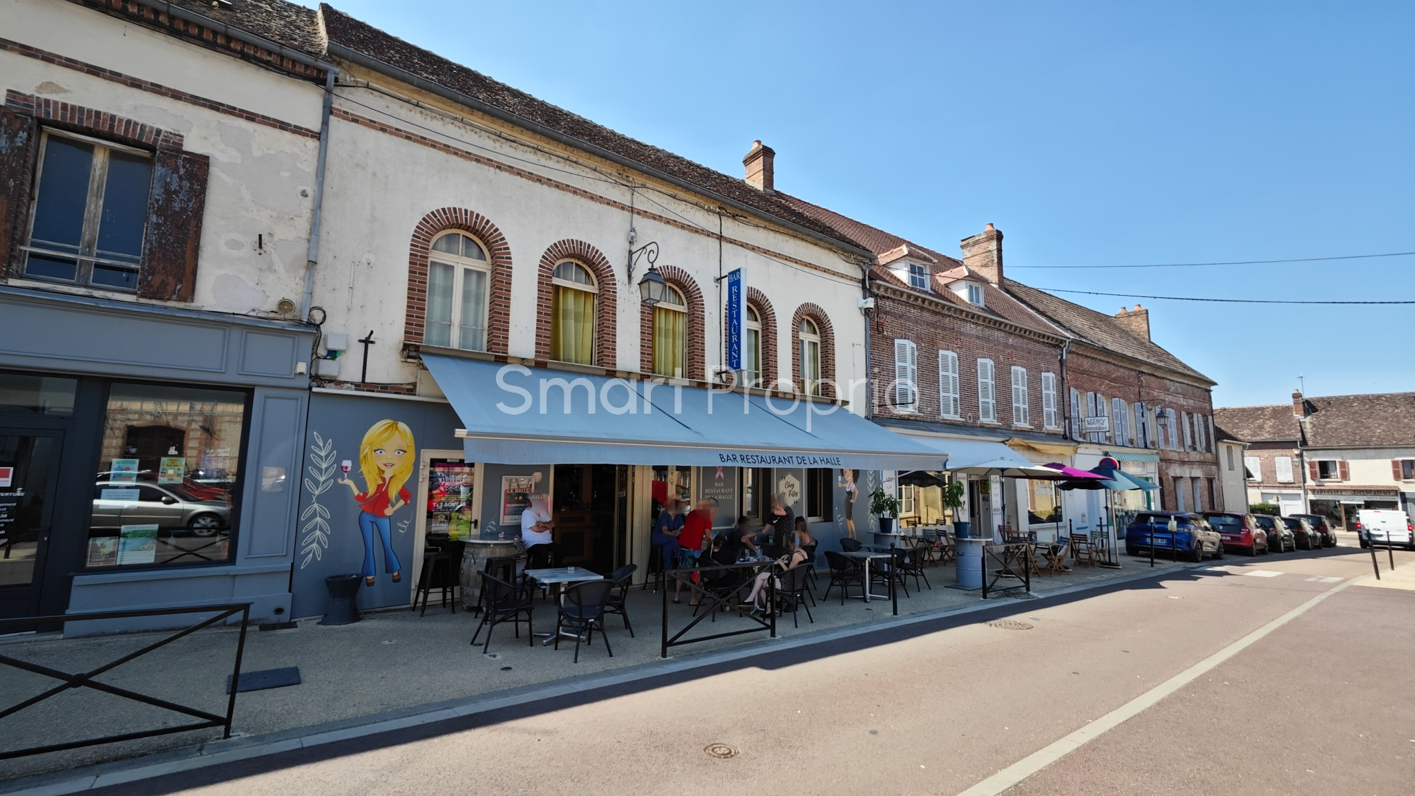 une grande terrasse sur rue devant la place du marché couvert de la ville.